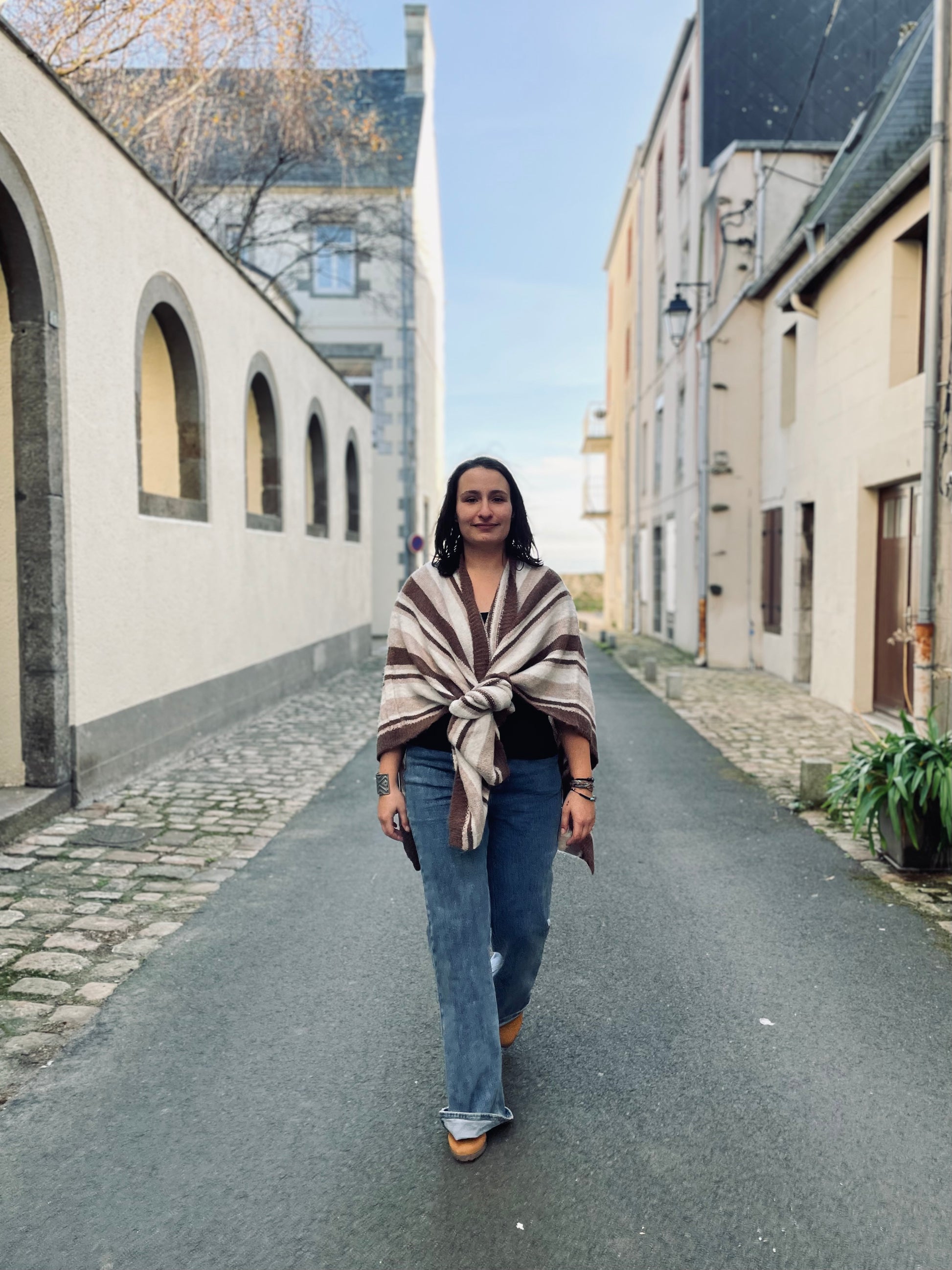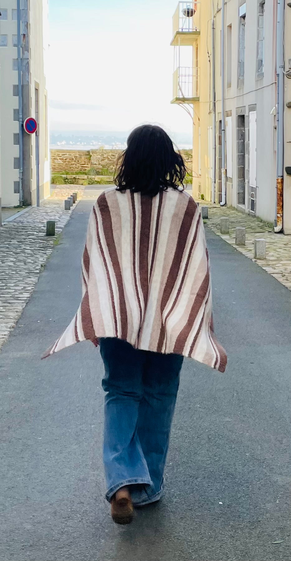 Avec ses rayures harmonieuses dans des tons crème et chocolat, il vous transporte instantanément dans un univers de sérénité et d’aventures. Léger mais chaud, il est idéal pour les balades en bord de mer, les après-midis cocooning ou vos escapades en plein air.